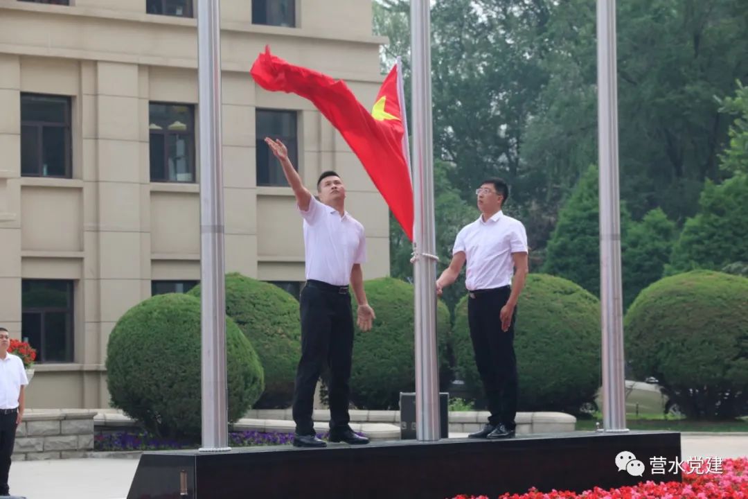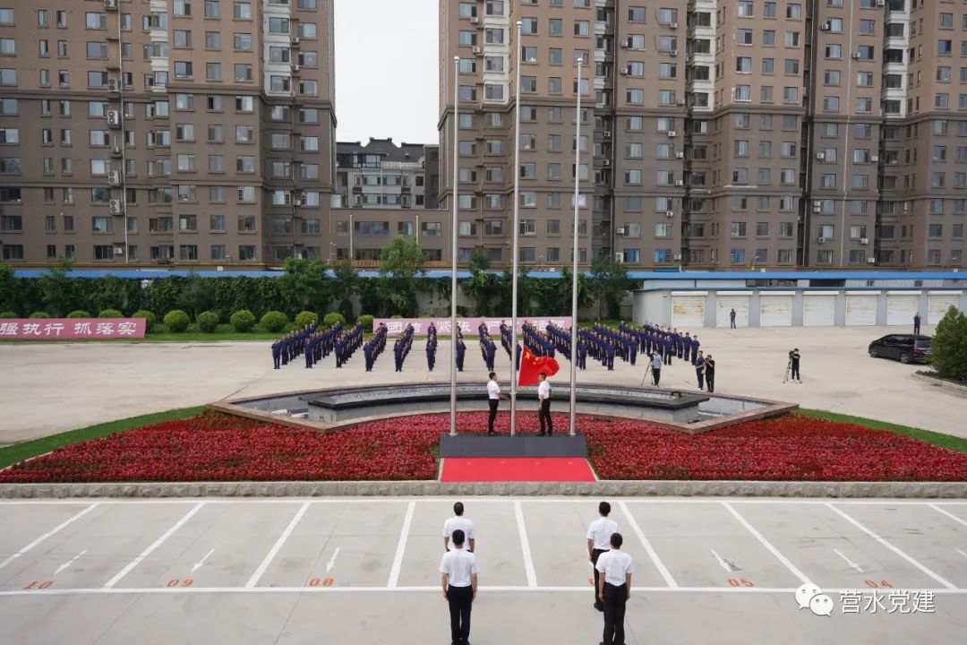 全體黨員整齊著裝,在辦公樓前列隊(duì),英姿颯爽的護(hù)旗手邁著鏗鏘有力的步伐,托舉五星紅旗走向升旗臺(tái)。