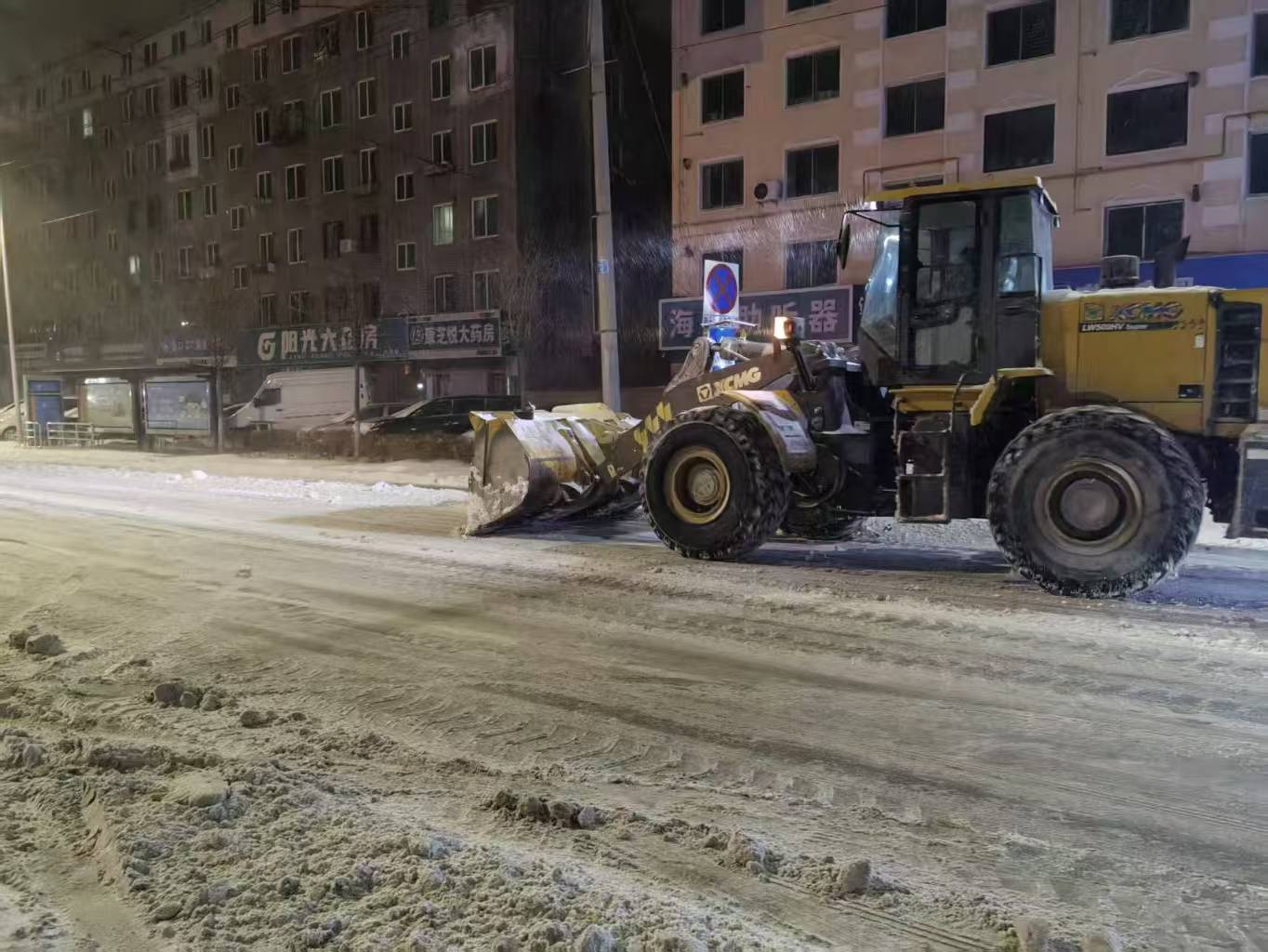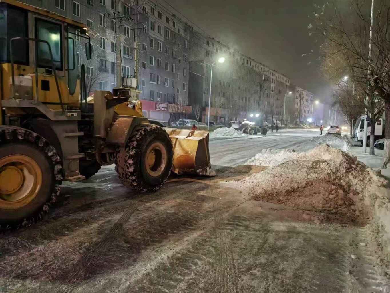 雪情就是命令,保障即是責(zé)任。集團(tuán)組建80余人的應(yīng)急清雪隊(duì)伍,調(diào)配推雪鏟車8臺(tái),裝雪鏟車2臺(tái),運(yùn)雪車8臺(tái),做好全流程準(zhǔn)備。凌晨3點(diǎn),天色未亮、寒風(fēng)料峭,清雪隊(duì)伍已全員集結(jié)、整裝出發(fā)。機(jī)械鏟車開道破冰,人工隊(duì)伍跟進(jìn)清掃,人機(jī)協(xié)同高效作業(yè),從新興大街東新路口到西環(huán)路口全力清除積雪,為市民出行掃清障礙。