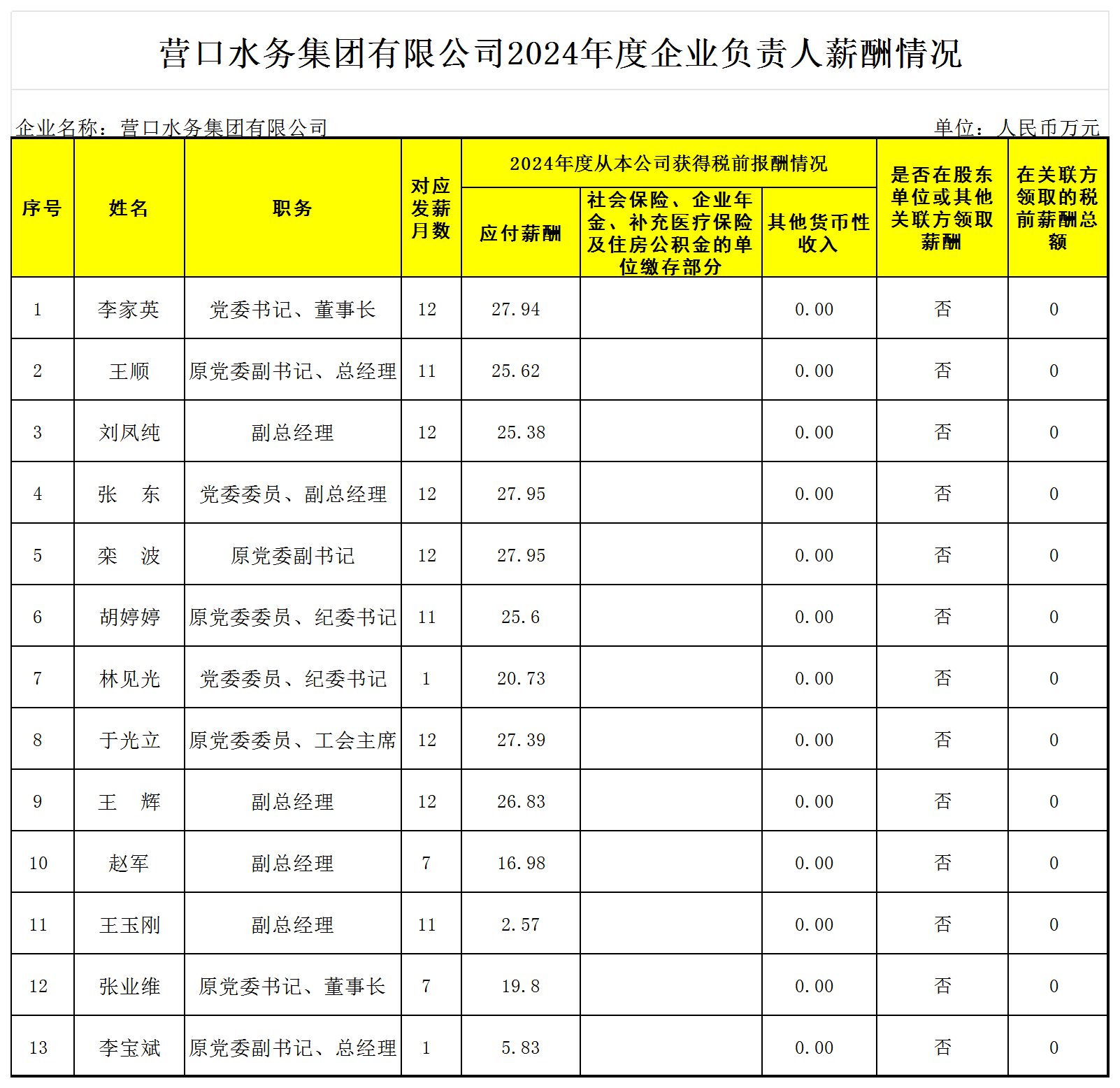 營口水務(wù)集團(tuán)有限公司2024年度企業(yè)負(fù)責(zé)人薪酬情況